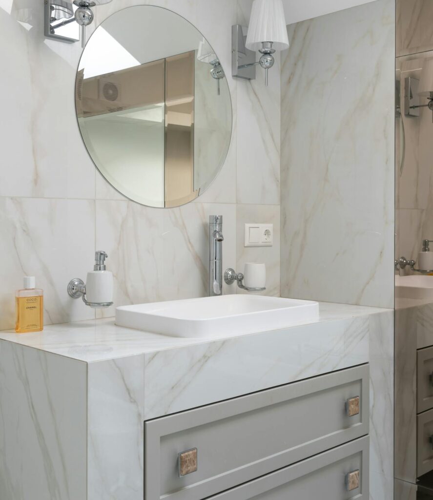 Our cast stone and solid surfaces are highly resistant to chemicals. Unlike natural marble, which can be permanently etched or stained by acidic soaps, makeup, or hair dye, our non-porous surfaces allow you to simply wipe away spills without fear of permanent damage.